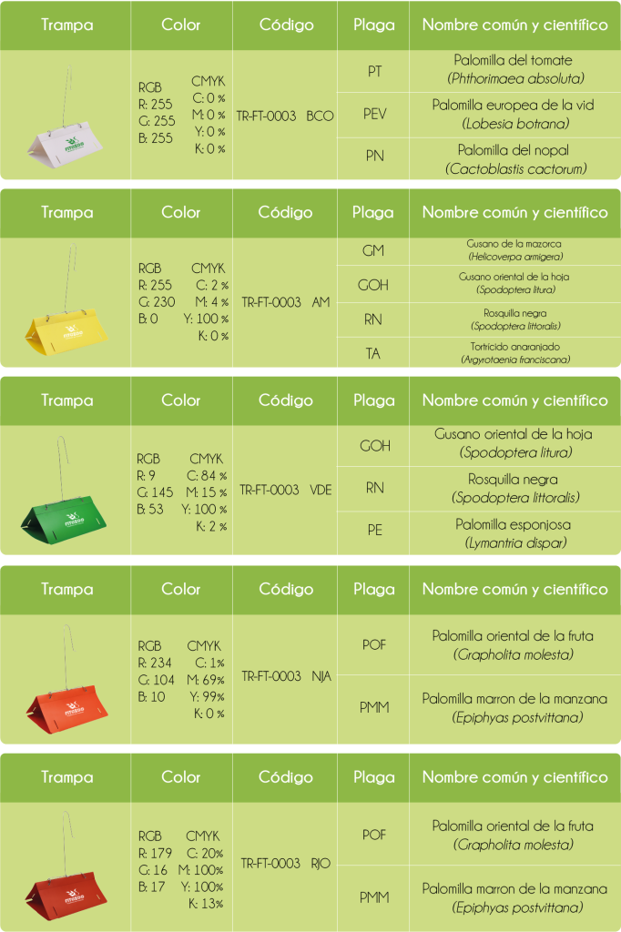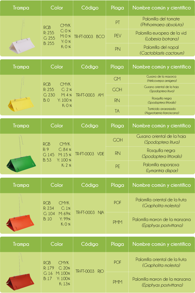 Trampa Delta 5C TRAMPAS TRAMPA DELTA 5C DESCRIPCIÓN Elaborada con plástico POLIPAP de 20 PTS, con adhesivo. Las trampas son desmontables, lo que permite su mejor conservación y almacenamiento. CARACTERÍSTICAS El material de la trampa es plástico POLIPAP de 20 PTS. El material del gancho es alambre galvanizado de 1.7 mm. De 5 diferentes colores: blanco, anaranjado, rojo, amarillo y verde. Las dimensiones son, cuadrícula de 1.9 x 1.9 cm, con logo, mide de 19 x 18.7 cm. Ficha Técnica Toda la información sobre nuestro producto. VER PDF